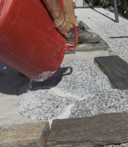 Produit à base d’eau, non nocif, qui fixe les graviers entre eux, sans compromettre la perméabilité.